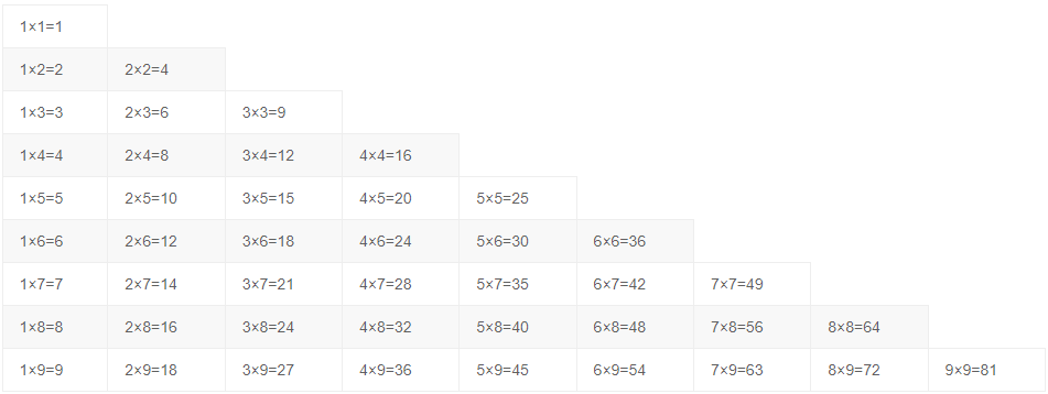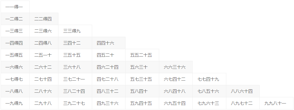 | 一九得九 | 二九十八 | 三九二十七 | 四九三十六 | 五九四十五 | 六九五十四 | 七九六十三 | 八九七十二 | 九九八十一 |
